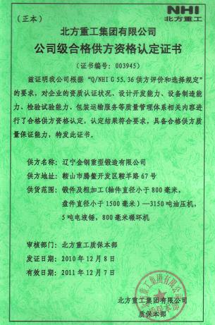 2010年12月,北方重工集團有限公司對我公司的資質認證狀況、設計開發能力、設備制造能力、檢驗試驗能力、包裝運輸服務等質量管理體系相關內容進行了合格認定,認定我公司具備合格供方質量保證能力,并為我公司頒發了公司級供方資格認定證書(見下圖)。